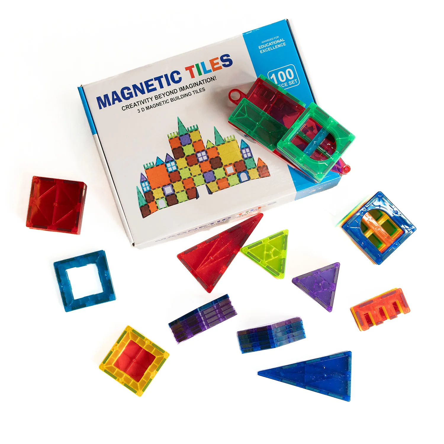 100 piezas acrílicas imantadas de diferentes formas y tamaños en colores transparentes (incluye 2 carritos).
