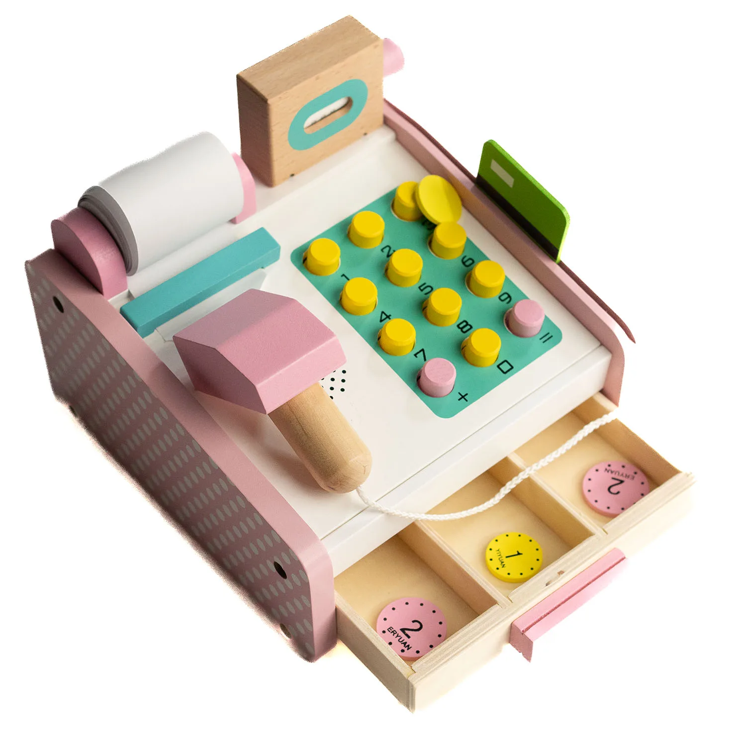 Caja registradora de madera con lector de código de barras.