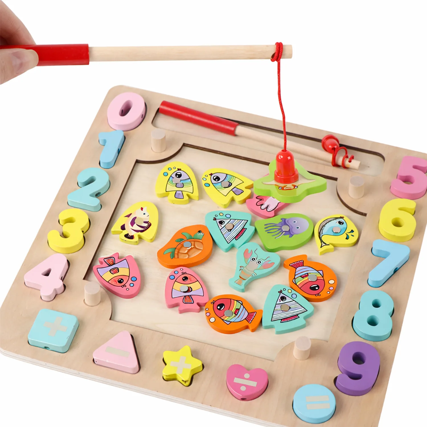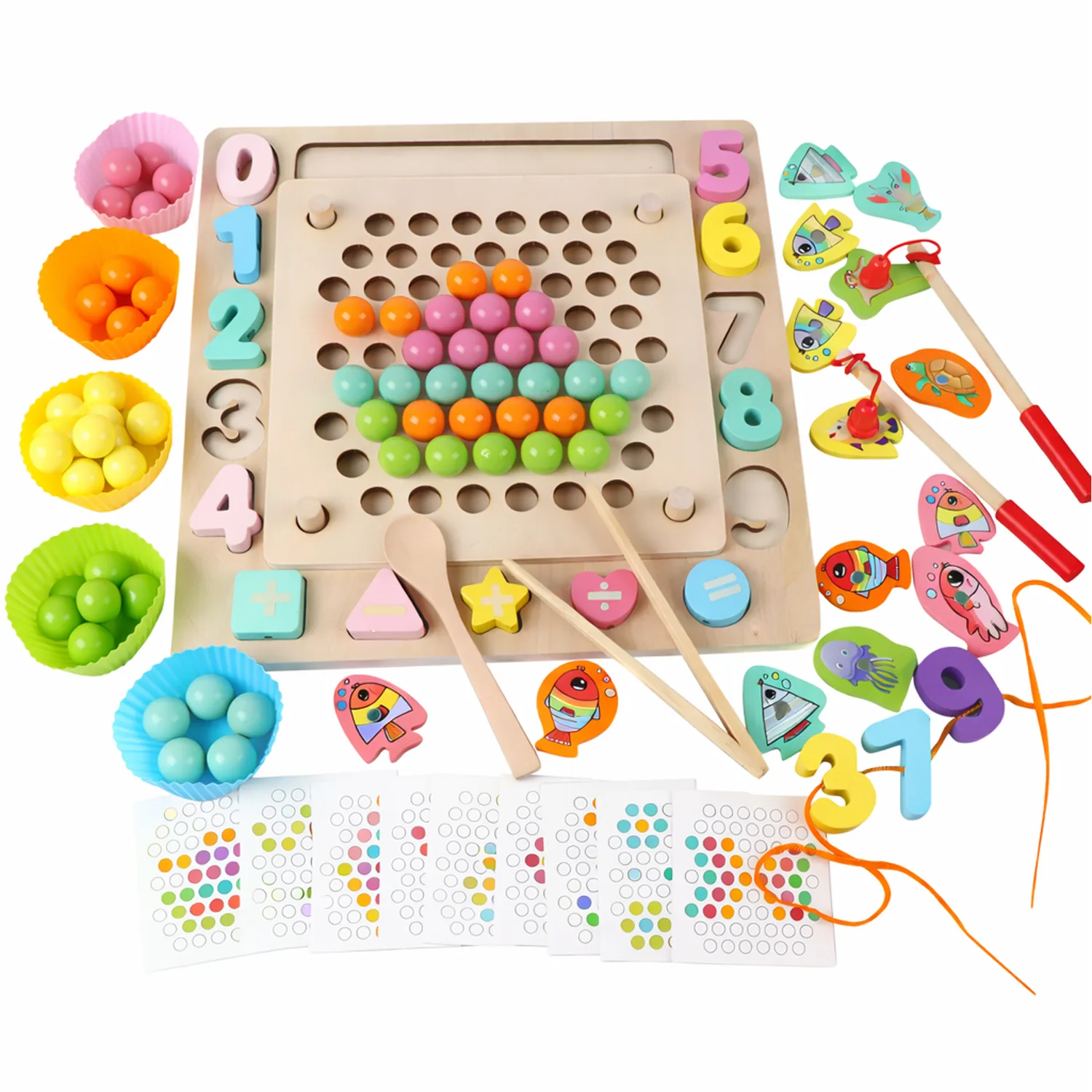 Favorece el desarrollo de la motricidad fina, la coordinación óculo-manual y la concentración al utilizar pinza, cuchara, caña magnética y enhebrador. Asimismo, estimula la organización espacial y la resolución de problemas mediante el uso de tarjetas con patrones.